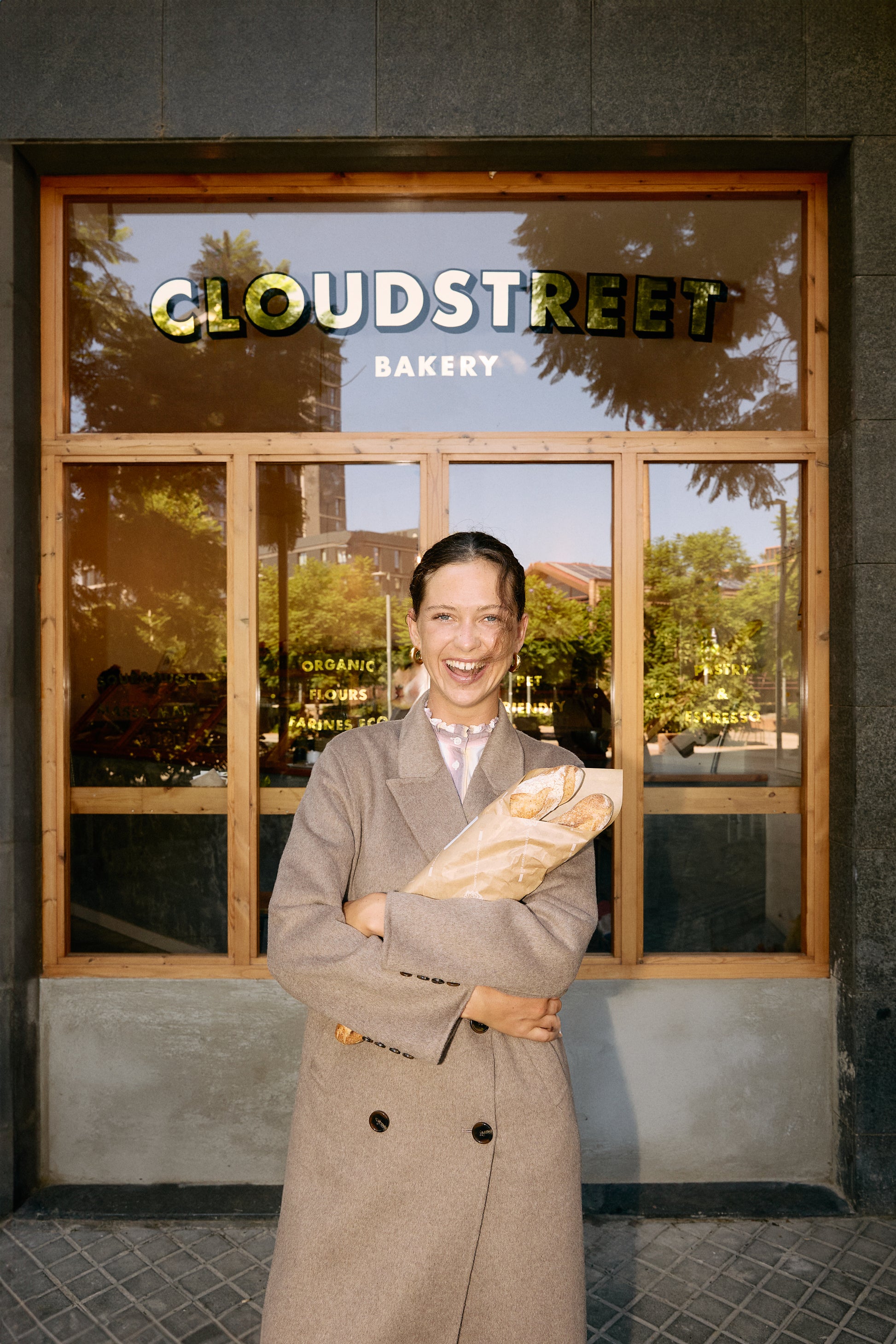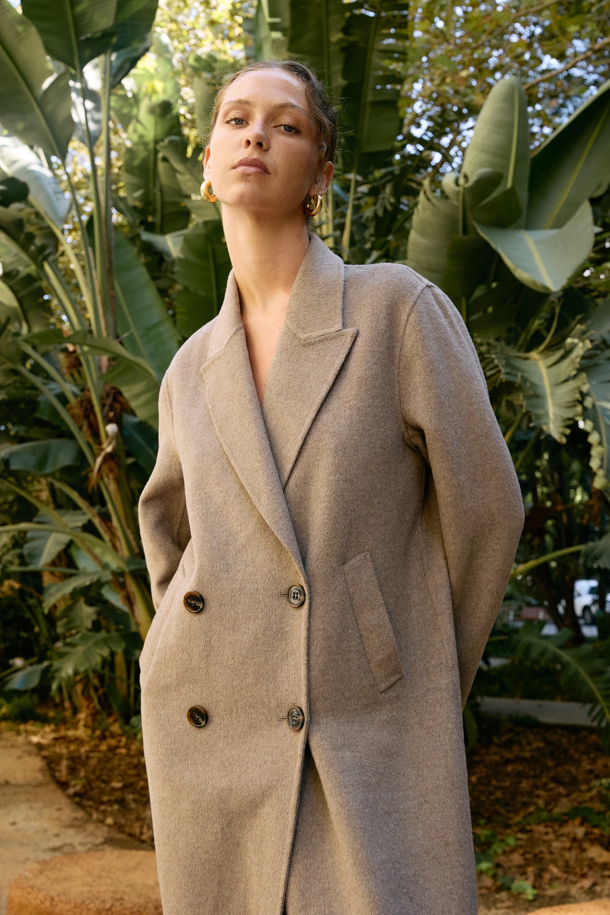 Abrigo extra largo. Solapa ancha. Con bolsillos laterales.