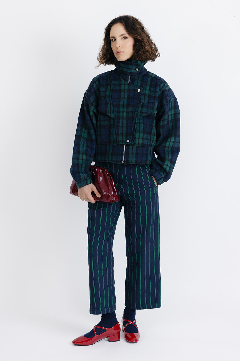 Descubre nuestra bomber de cuadros estructurada, una prenda clave para elevar cualquier look esta temporada. Confeccionada en un tejido cálido y suave, presenta un estampado tartán en tonos azul y verde, perfecto para añadir un toque sofisticado y actual a tu armario.