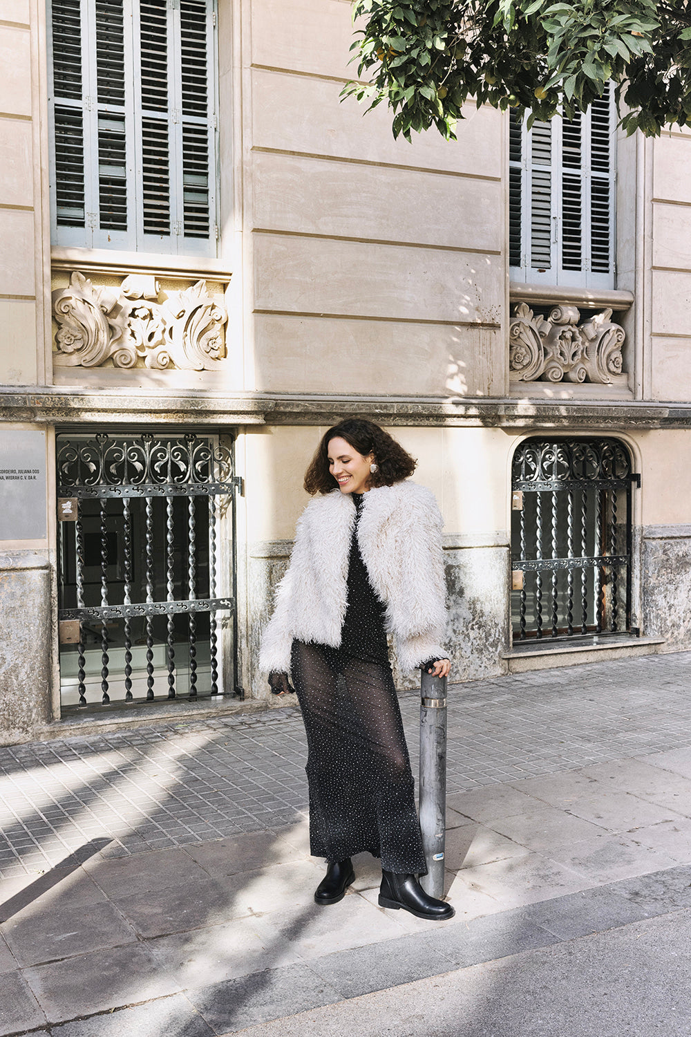Confeccionado en malla negra elástica salpicada de microcristales, este diseño se ajusta al cuerpo como una segunda piel y crea un efecto luminoso que transforma la silueta. Su acabado ligeramente transparente aporta un toque atrevido pero sofisticado, perfecto para la noche.